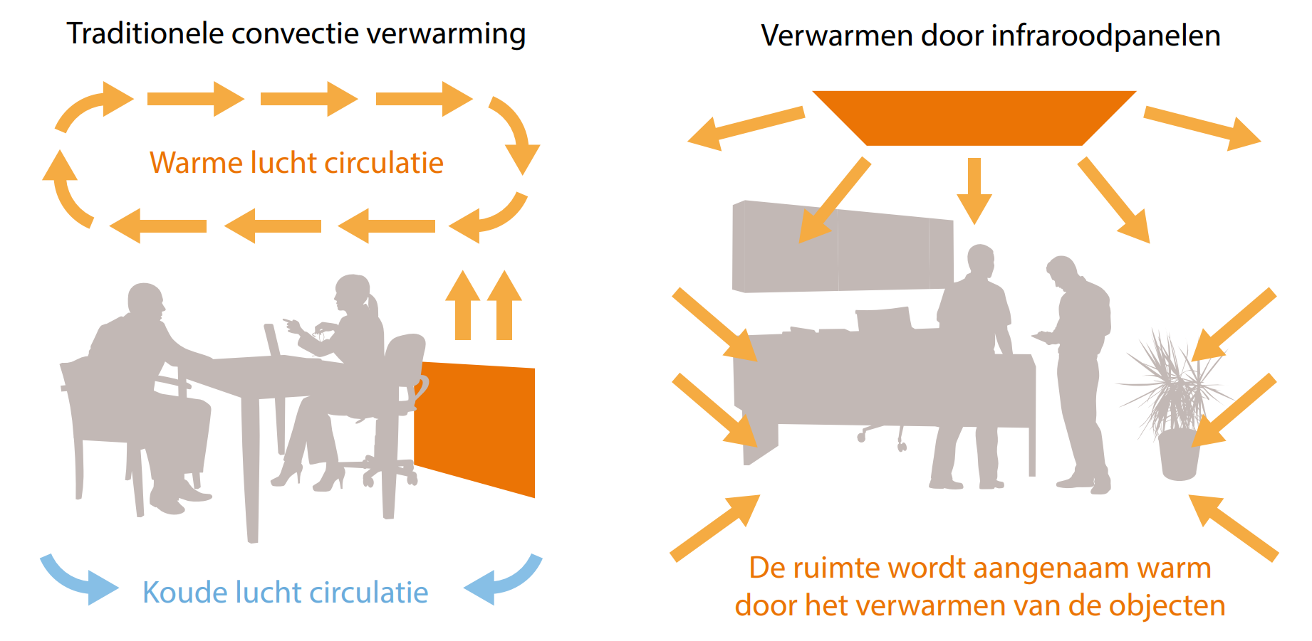 HR-infrarood verwarming is het beste te vergelijken met verwarming door de zon. Met infrarood wordt niet de lucht verwarmd, maar de massa, het object.