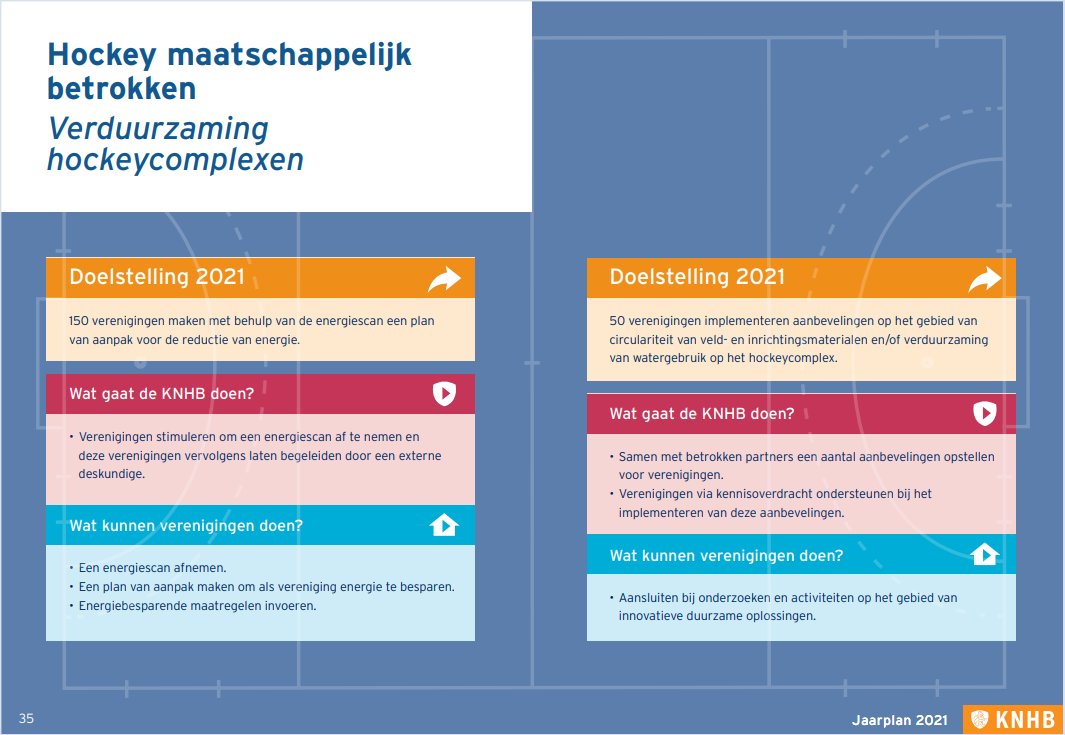 Hieronder vindt u pagina 35 van het jaarplan 2021 van de KNHB waarin de bond beschrijft wat hun doelstelling is met betrekking tot het verduurzamen van hockeyaccommodaties.
